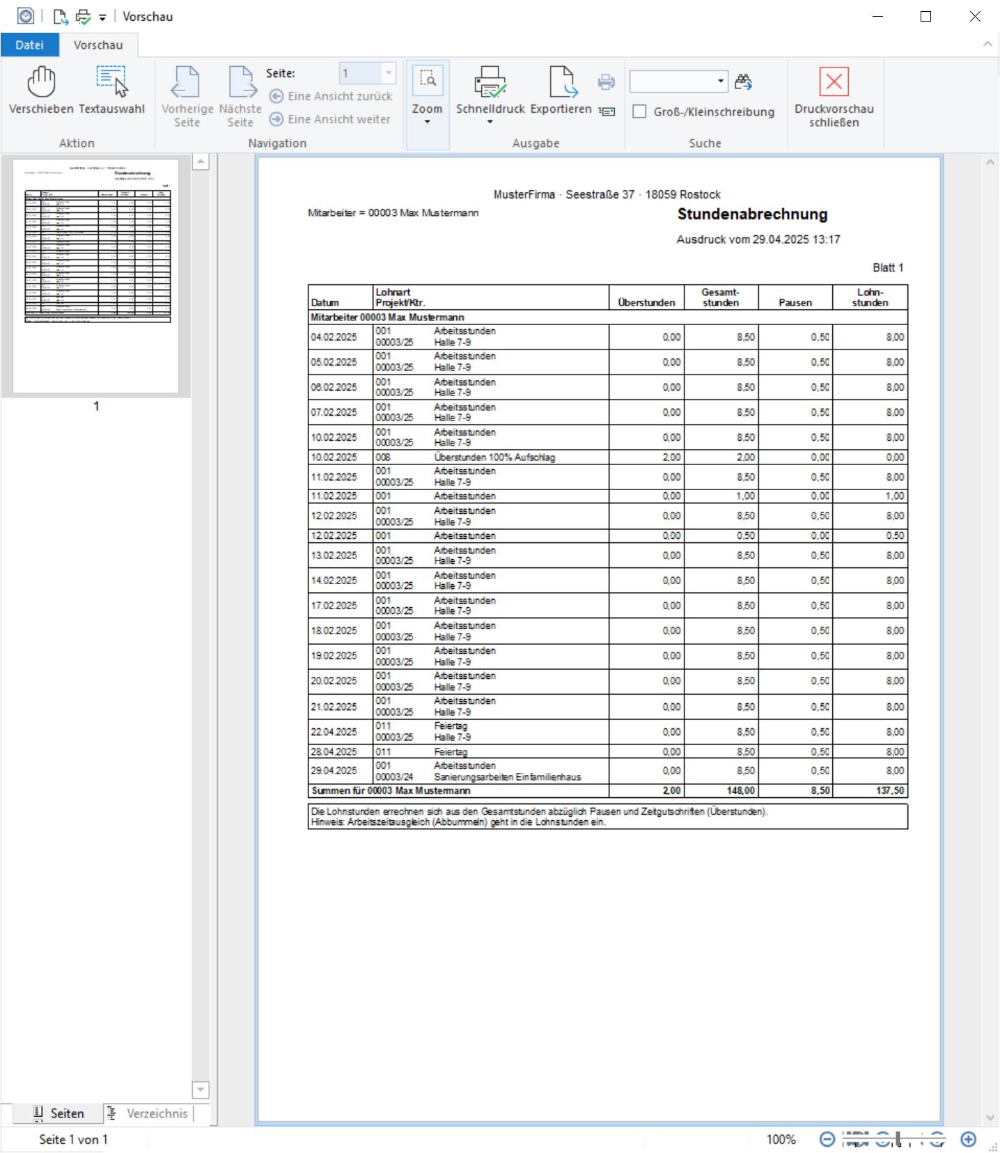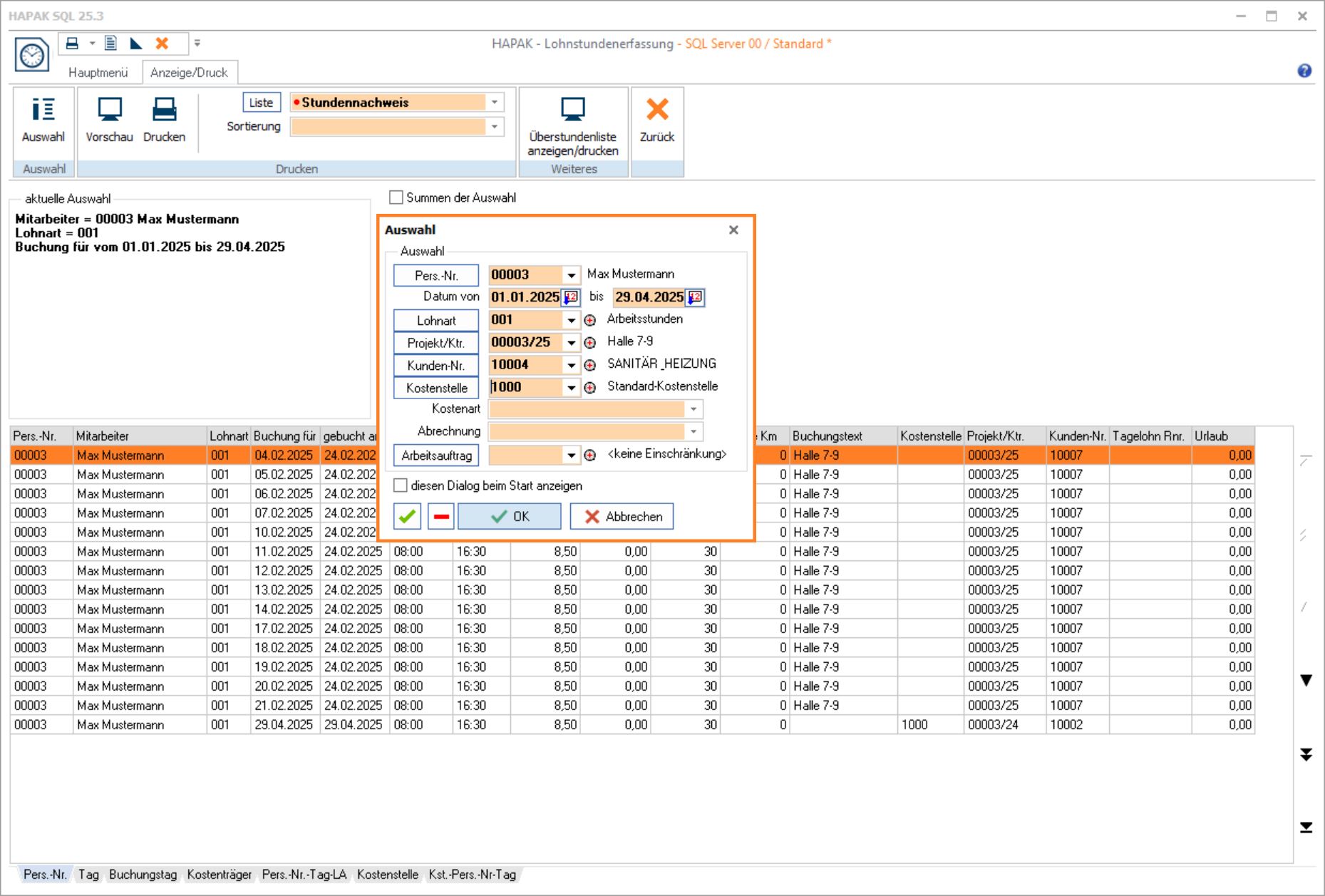 zahlreiche Auswertungen, z.B. Gesamt oder Mitarbeiter nach Projekt, Lohnart oder Kostenstelle (LohnSt-06)