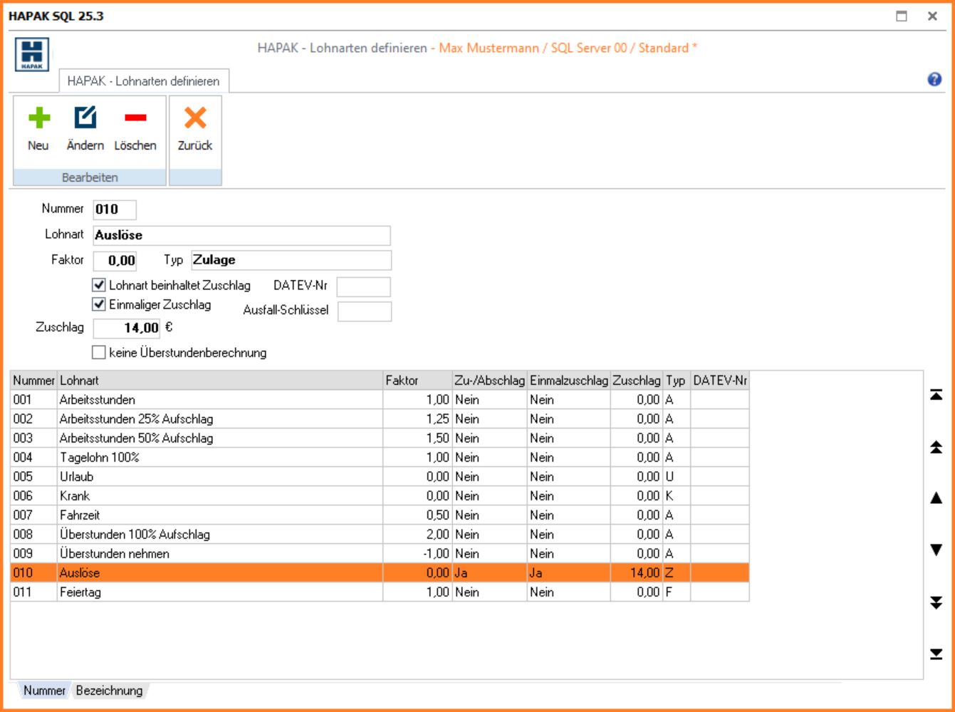 Anlegen von beliebigen Lohnarten (z.B. Arbeit, Urlaub, Krank oder Fahrzeiten…) mit oder ohne Zuschlag (LohnSt-02)
