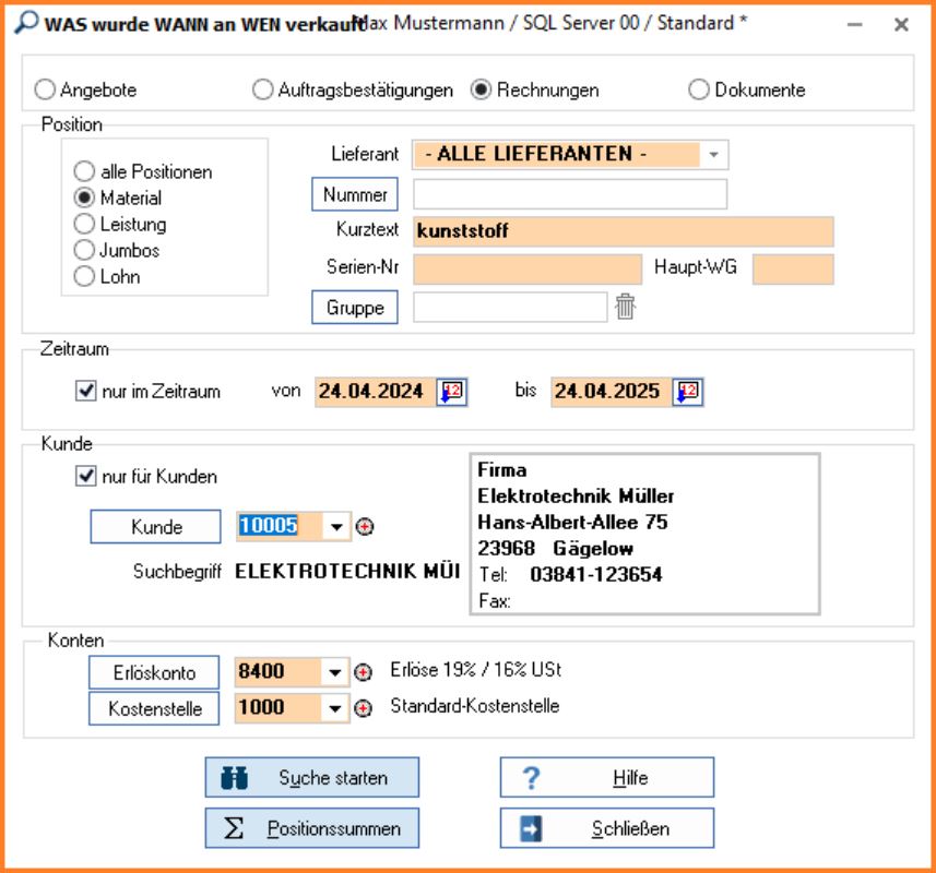 Filtern über Positionsart, Zeitraum, Adresse, Warengruppe oder Erlöskonten möglich (PH-01)