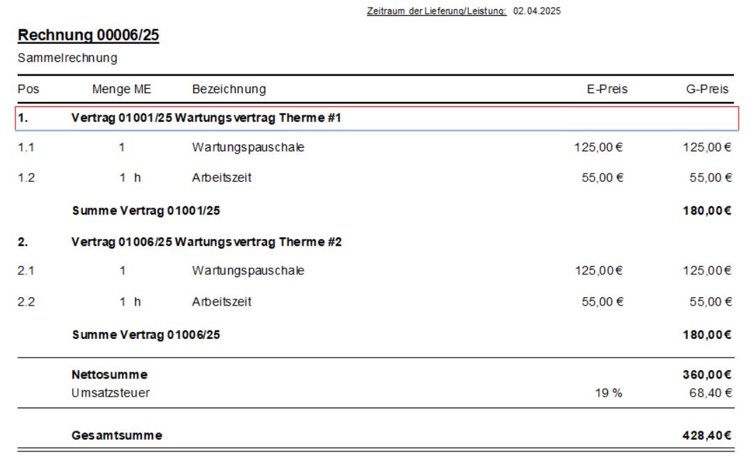Abrechnung über Sammelrechnungen möglich, z.B. mehrere Anlagen zu einem Vertrag (01, 02)