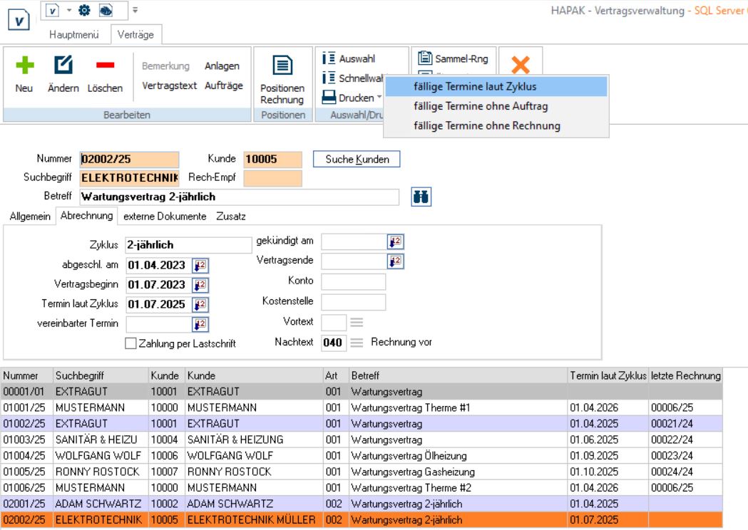 Verwaltung von Verträgen für Wartungen und Servicedienstleistungen. Fälligkeitstermine für wiederkehrende Wartungen und Dienstleistungen erstellen und sich von HAPAK daran erinnern lassen.