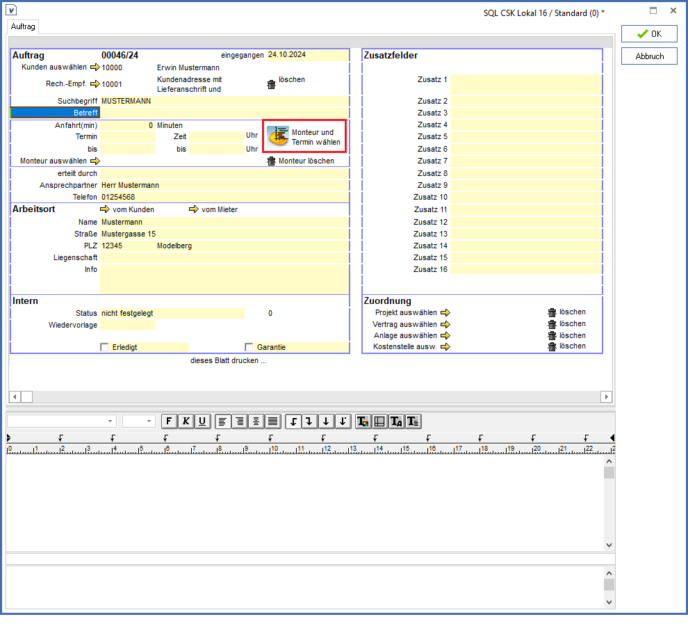 Auswahl von Monteur und Termin jetzt direkt über den Kalender, F3 öffnet die Personalauswahl.