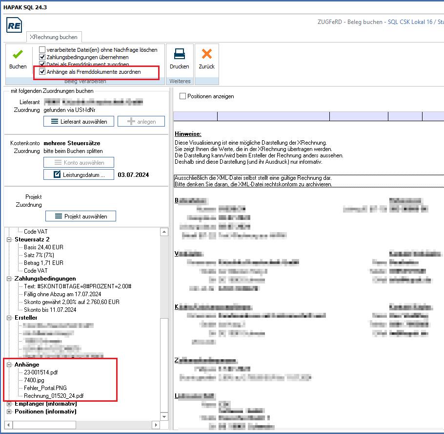 Anhänge werden angezeigt und können optional zugeordnet werden.