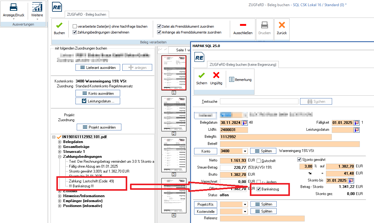 E-Rechnungen aktivieren den Haken "Bankeinzug" bei passenden Zahlungsarten automatisch.
