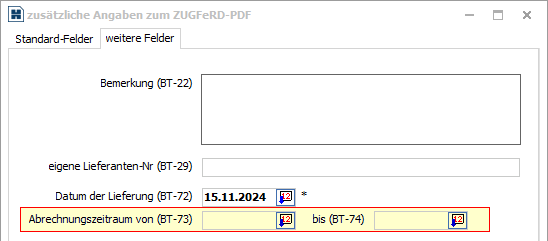 XRechnung-/ZUGFeRD-Ausgabe ergänzt die Formularfelder Lieferdatum und Leistungsdatum bis.